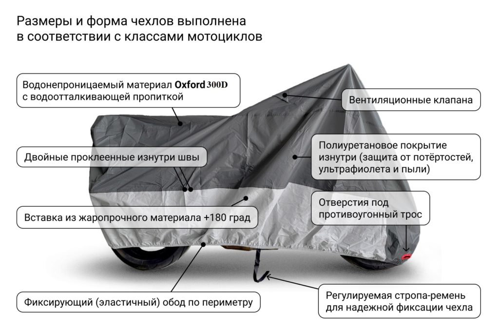 Функционал: Оберегает байк от погодных воздействий (снегопада, ливня, ветра и солнечного излучения), а также от технических загрязнений, случайно пролитых составов, пылевых отложений, уличной грязи, древесных выделений, чужих взглядов, птиц и животных.