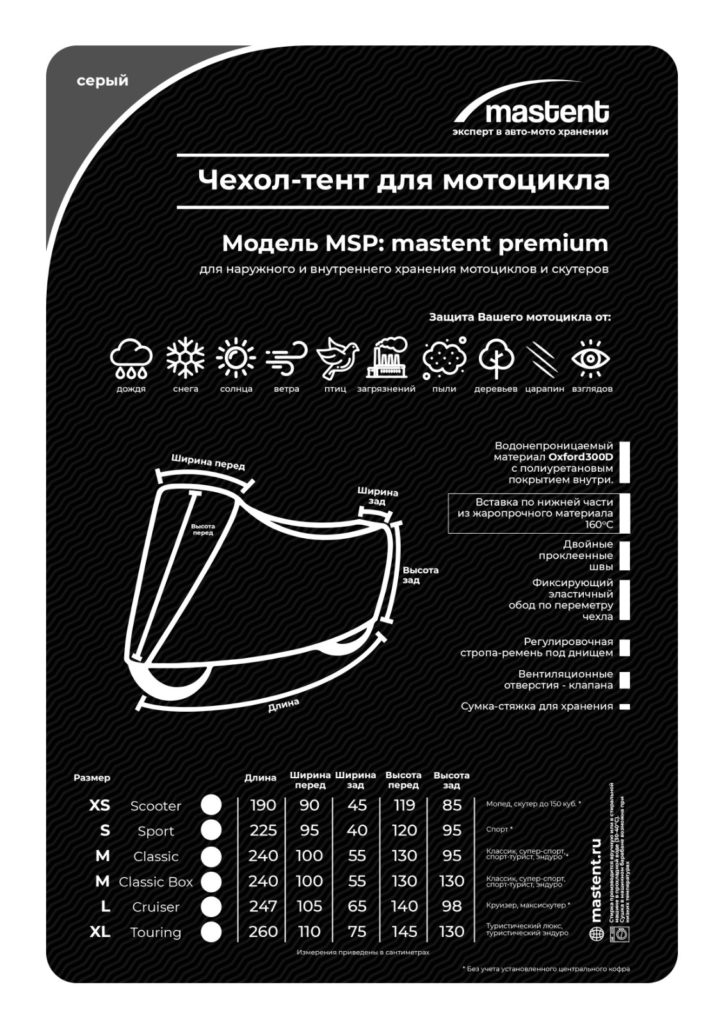 Модель Mastent premium (M Classic BOX) предназначена для эксплуатации при уличном или гаражном хранении мотоциклов Honda, Kawasaki, Yamaha, Suzuki, BMW, Triumph, Ducati , Harley Davidson, оборудованных центральным кофром. Подходит для следующих категорий: