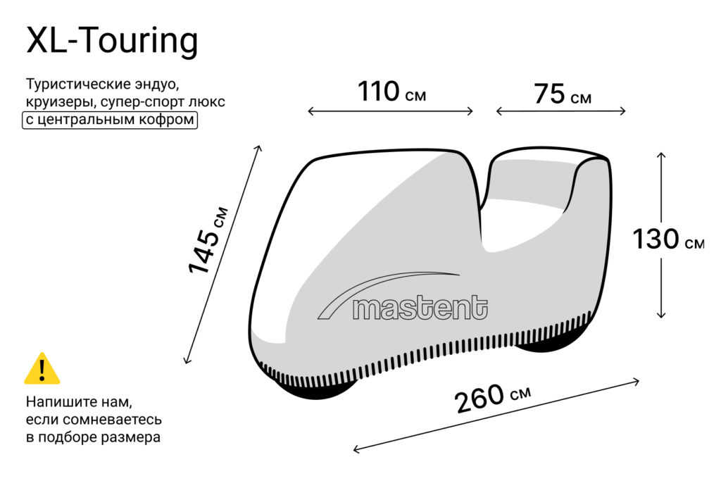 Модель Mastent premium (XL-Touring) специально разработана для размещения мотоциклов Honda, Kawasaki, Yamaha, Suzuki, BMW, Triumph, Ducati , Harley Davidson, а также других моделей мотоциклов с центральным и боковыми кофрами при хранении на открытых площадках или в гараже. Чехол подходит для следующих категорий техники: